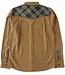 Casual fit, long sleeve button up shirt, stand collar, two chest pockets with flap and button closure, western style plaid bias cut front and back yoke with side pleats, plaid lined collar band, adjustable cuffs and logo snap on sleeve placket, 25% certified recycled polyester faux horn buttons, curved hem