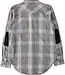 Boyfriend fit, long sleeve button up shirt, stand collar, two chest flap pockets, elbow patches, adjustable cuffs, 25% certified recycled polyester matte buttons, deep curved hem.