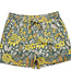 Relaxed fit mid-rise short, elastic waistband with drawstring, front pockets.